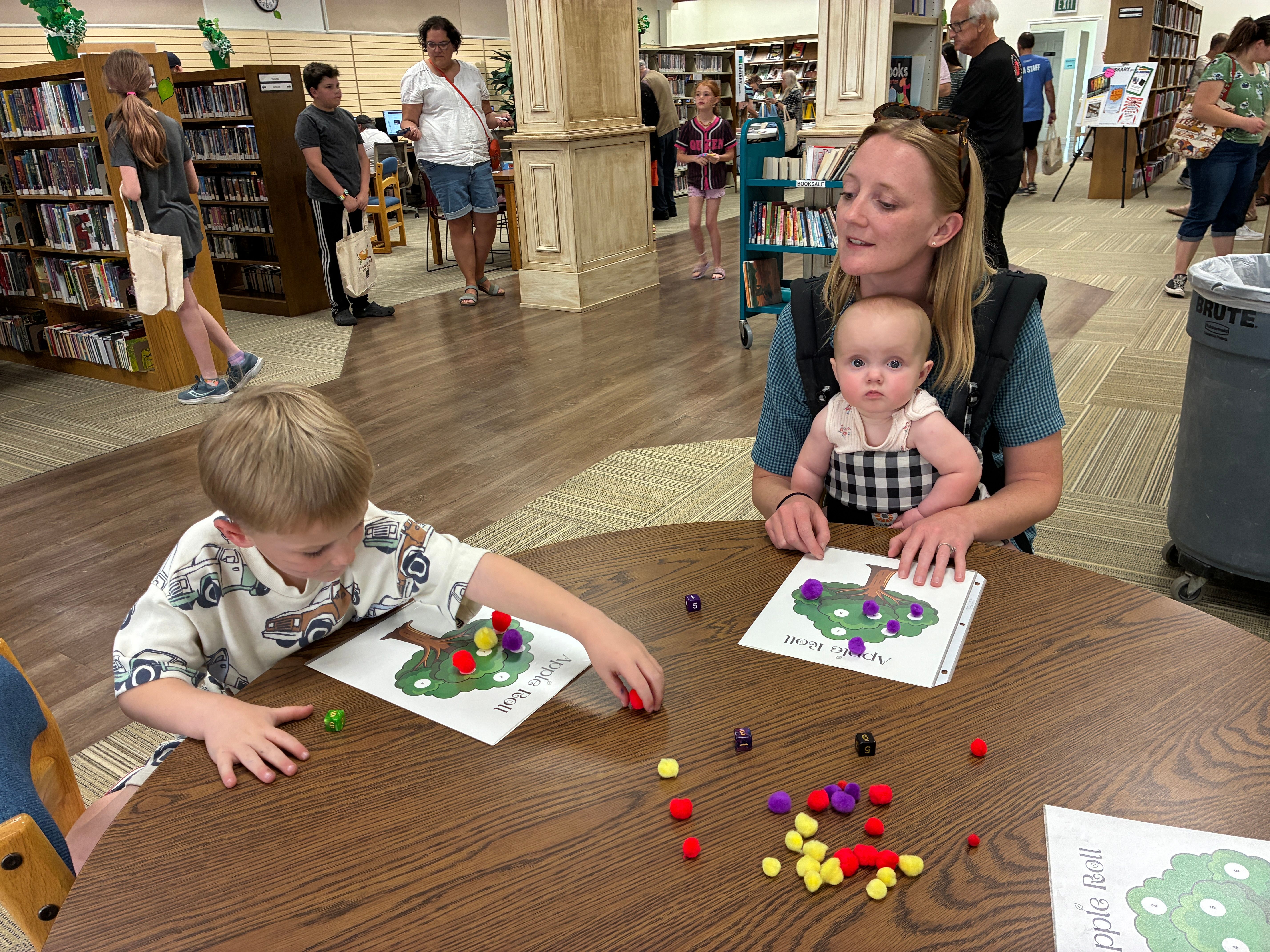 Kayla Camp and her children Elijah, 5 and Matilda, 8 months, play a game at the grand opening of the ‘Twig.’ The temporary library is in the old Wight House dress shop building on Main Street in Bountiful. Photo by Becky Ginos